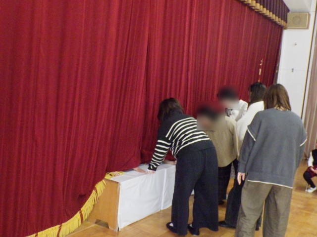 プレゼントをもらった後は、誕生会恒例の「この手誰の手?」ゲームです。カーテンの下から見えるかわいらしい手を触ったりつないでみたりして、「どれだろう?」と迷っておられるお家の方の姿もありました(^^)v みんな、お家の方に当ててもらえてよかったね!