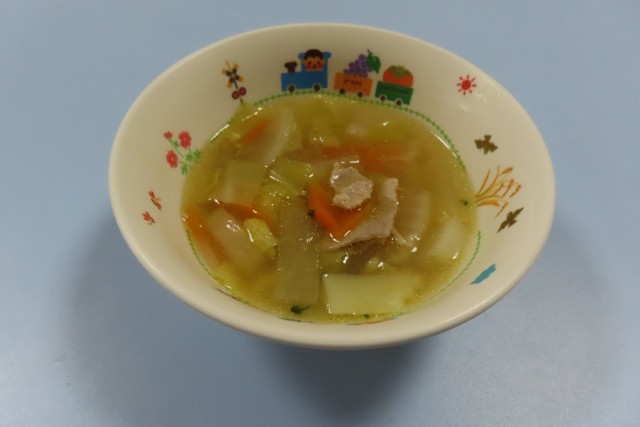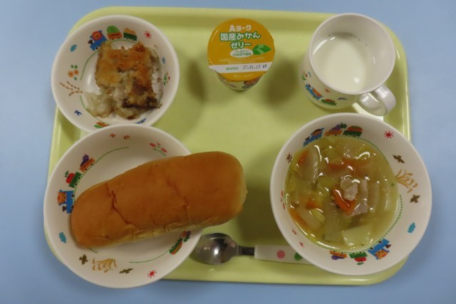 6日 ‥ 押し麦のグラタン スープ みかんゼリー おさつパン 牛乳