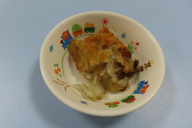 ビタミンやミネラル、食物繊維が豊富で栄養価の高い押し麦のグラタン、米粉がパリっと焦げ目もあり、おいしかったです。今日はデザートのみかんゼリーもあって大喜びでした。ごちそうさまでした。