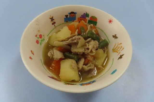 煮物には野菜もたくさん入っていますが、おいしくてパクパク食べていました。もやしの甘酢和えはいつも人気。ペロッと食べて、「おかわり!」という子どもが多くいます。今日もおいしくいただきました。ごちそうさまでした。