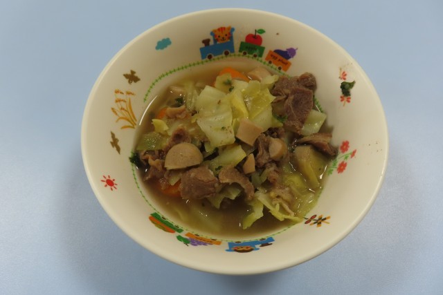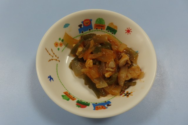ケッチャプソテーは、タマネギ、ピーマンもたっぷり入っていますが、柔らかくしてありますし、おいしかったようで、よく食べていました。ポトフも合わせて、パンも食べやすく、完食、おかわりたくさんいました。ごちそうさまでした!