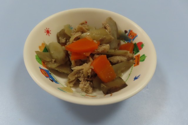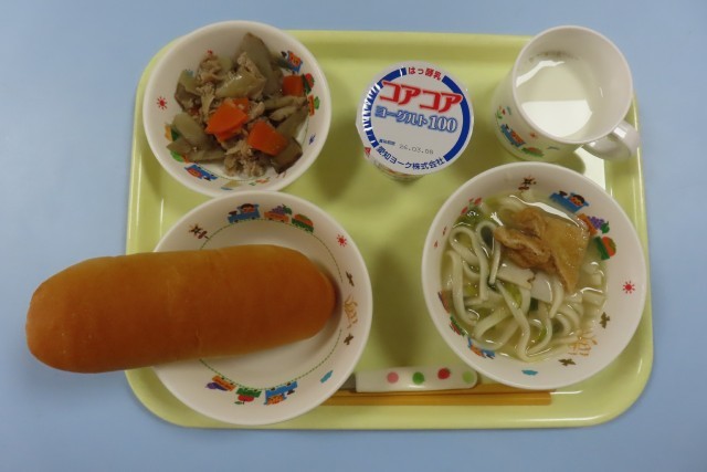 19日 ‥ 豚肉とごぼうの煮物 なにわうどん ヨーグルト パン 牛乳