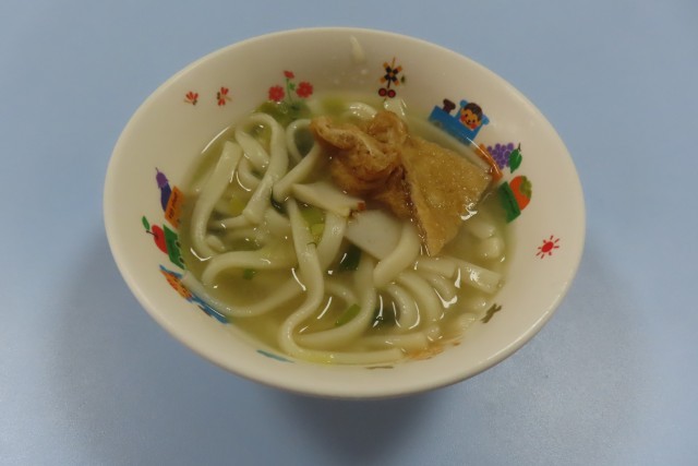 なにわうどんが大人気 「きつねうどんやな」と、三角のうすあげが入っているのを見て言う子どももいて、なじみがあることが分かります。大阪名物とも言えるのではないでしょうか。ツルツルっと吸い込んで、最後につるっと口に入るときに、出汁がはじけるように少し口の周りにつくのを楽しむ姿もありました。かまぼこや白菜、青ネギも入っていましたよ。削り節とだし昆布でとったおいしいお出汁を飲み干していました。ごちそうさまでした。
