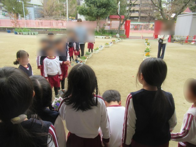 4歳児はな組は、修了式のために、プランターの花をみんなで運んで、花道をつくってくれました。ありがとう!