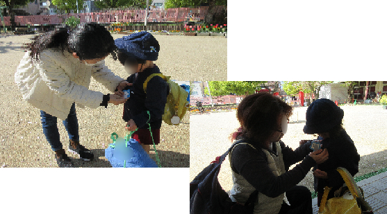 園庭でお家の人に名札をつけてもらいます。ピカピカの空色の名札。うれしいですね。何だか顔も少しお兄さん、お姉さんになったように見えます。