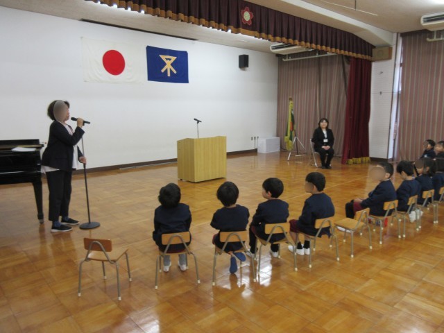 遊戯室で、最初は新しく九条幼稚園に着任した先生の紹介です。続いて始業式。挨拶には自分も相手の気持ちがよくなるなど、いろいろな力があることや、友達の素敵なところ、よいところをいっぱい見つけると、一緒に楽しく遊ぶことができるという話を聞きました。