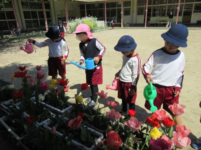 始業式の後、園庭で久しぶりに遊びました。風で飛んだ桜の花を見つけたり、風に舞う花びらをキャッチしようとしたりお花に水をあげたり…「チューリップだーいすき」という声が聞こえてきました。園庭に春がいっぱいですね。早寝、早起きをして、朝ごはんをしっかり食べて、明日からも元気に幼稚園に来てください。今年度もいっぱい楽しく遊びましょう!