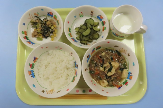 9日 ‥ マーボーどうふ きゅうりの中華和え ツナとチンゲン菜の炒め物 ごはん 牛乳