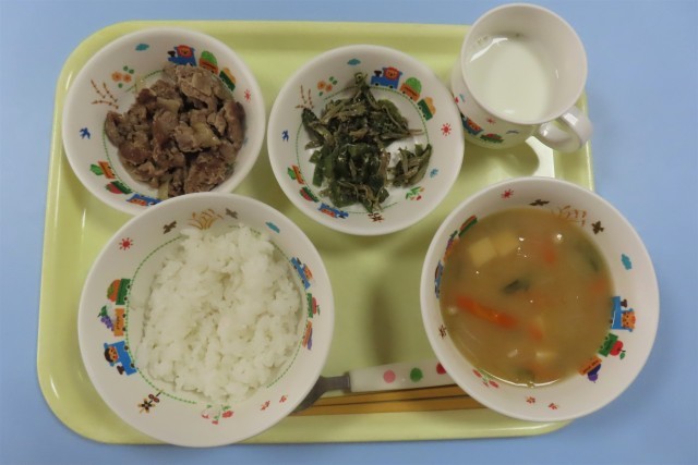 豚肉の甘辛焼きが人気でした。5歳児そら組の子どもたちは、少し苦手かな、と思っても食べてみるようになっていて、じゃこピーマンもみんな食べていました。「なんかお魚の味がする気がした」「前はピーマン食べられへんかったけど、給食は食べられるねん」などと話しながら食べる姿もありました。中には、「おかわりもう一回!」と、二度目のおかわり希望もありました。味噌汁の豆腐などの具材も箸でうまくはさんで食べるようになってきています。ごちそうさまでした。