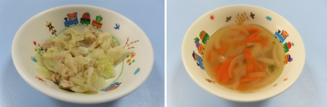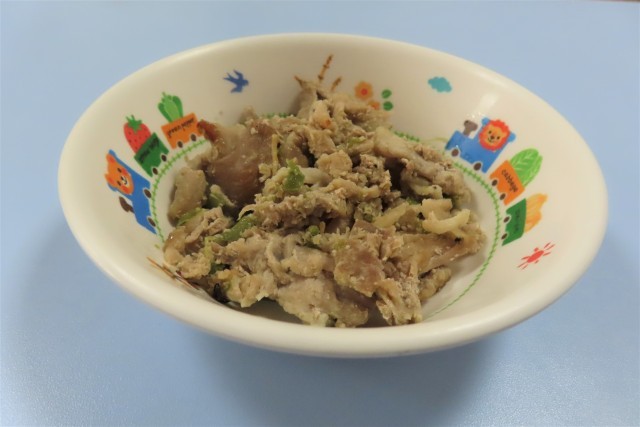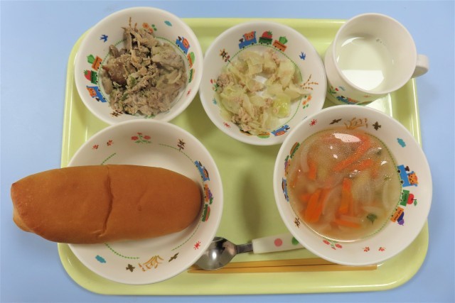 年少4歳児にとって二日目の給食でした。豚肉のガーリック焼きには、ピーマンが入り、スープには鶏肉の他に、ジャガイモ、タマネギ、ニンジン、パセリ、そしてツナとキャベツのソテーにはキャベツなど、野菜がいっぱいでした。でも、少しは食べてみようと頑張っていました。また、来週、いろいろな献立がありますよ。楽しくいただきましょう。ごちそうさまでした。
