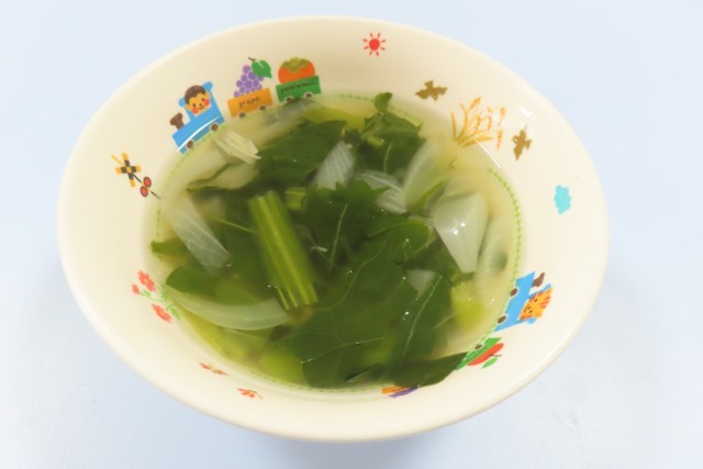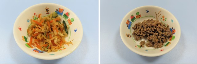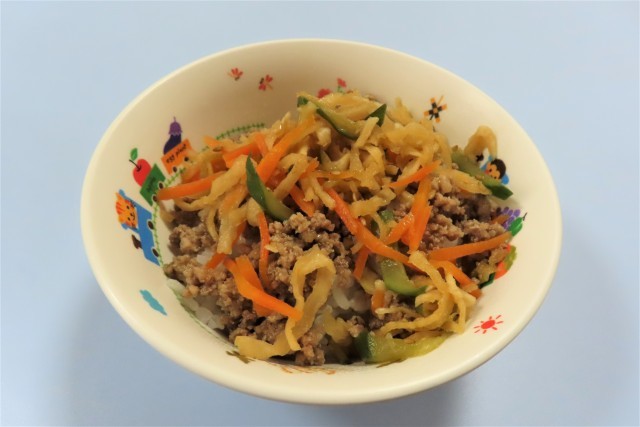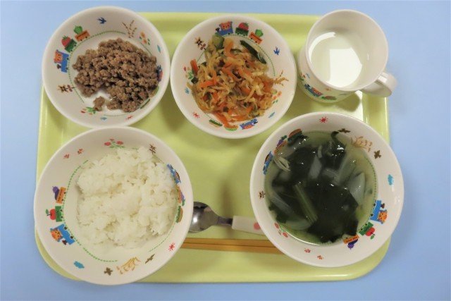 今日はビビンバでした。別々のお皿に出てきた肉と野菜を、ごはんの上にすべてのせて一緒に食べる子ども(写真4枚目)と、そのまま食べる子どもがいます。給食が始まって間もない4歳児は、お肉だけのせている子どももまだまだいます。ビビンバの野菜の中から、ニンジン、キュウリ、切り干し大根を、一つだけ口にしてみようとする姿もありました。お家の方から離れ、自分で頑張って食べているのに拍手です。5歳児そら組は、さすが、パクパク食べていました。ごちそうさまでした。