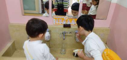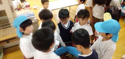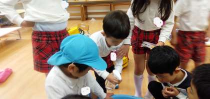 さすが、毎日虫を探しているうめ組の虫博士たち。見るなり「土が白くなって(乾いて)いるからだよ」「もっと黒い土を入れてあげたらいいよ」「ダンゴムシは隠れるのが好きだから葉っぱも入れてあげたらいいよ」と優しく、分かりやすく教えてくれました。「先生、シュッシュってするやつ(霧吹き)貸してあげたら?」ということで霧吹きを渡すと、水の入れ方まで教えてくれていました。ばら組のダンゴムシも、これから元気に育っていくといいですね!