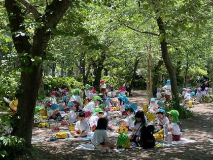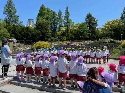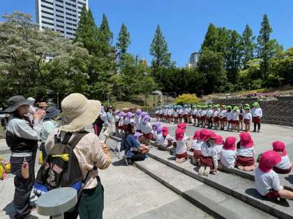 バラ園コンサートの場所で1曲歌ってみました。4歳児すみれ組ばら組さんが聴いてくれました。ちょうどその時その場所でバラの手入れをされていたお花ボランティアの方々と阪神園芸さんも歌を聴いてくださいました。先日の靱公園花壇花植えで年長児に関わってくださった方たちです。そしてなんと公園を訪れていた方たちも足を止めて聴いてくださり、まるで素敵な可愛らしいゲリラライブのようでした。そのあとは木陰でおにぎりを食べてひと休みしました。