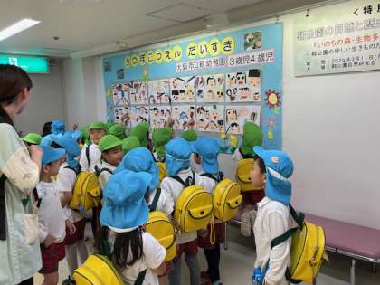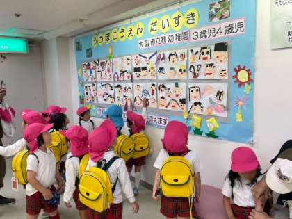 ?大阪科学技術センターに行きました。昨年度3月に3歳児4歳児の作品を展示してもらいましたのでそれを見に行きました。6月29日まで開催されている特別展「靱公園の自然と歴史 そして未来へ」のコーナーの一角に展示してもらっていました。子どもたちは「わー