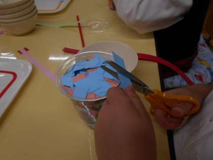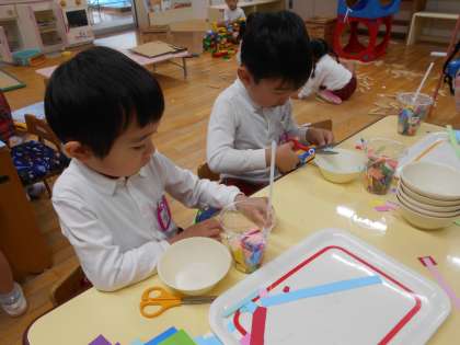 ひとつひとつ、ていねいに・・・ 公開日 2024/05/14 更新日 2024/05/14 うつぼ日記 4歳児のばら組さんのお部屋では、おいしそうなジュースが作られています☆ どうやって作っているかというと・・・細長い紙を、小さくなるように、チョキっと切っています。手でしっかりと紙をもって、はさみを動かしています。子どもたちが、はさみの刃に、ぐっと集中しているのが、伝わってきます!!はさみの使い方も丁寧になってきていますね。 次は、どんな味のジュースができるのか、楽しみです☆ いいね(0)