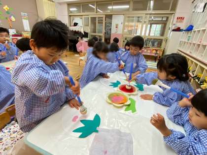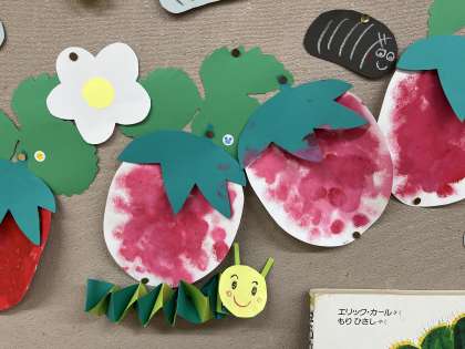 毎日「赤くなっているかなぁ?」と楽しみに見に行っているもも組の子どもたちです。先日は、「おいしいイチゴになあれ♪」と絵の具をペタペタとつけてイチゴの製作もしました。美味しそうなイチゴが出来ました。