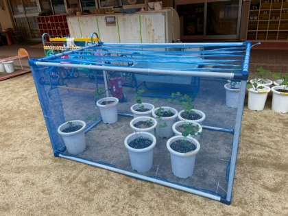 ? エダマメの若い葉っぱを鳥さんが狙うので、事業担当主事さんのアイデアでガードを作ってくれました。水やりする時はガードをすぐに外せるようになっています。エダマメを収穫することを楽しみにしながら大切に育てましょう。