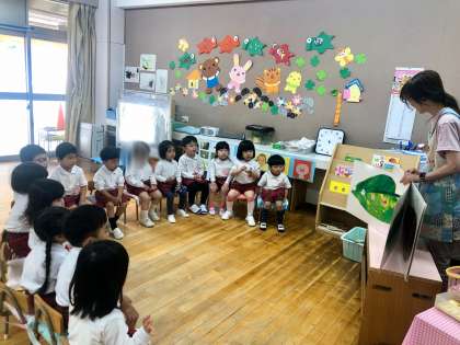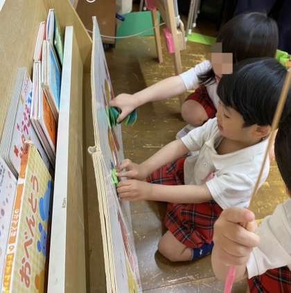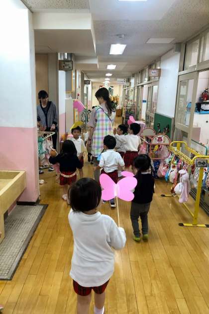 大型絵本を自分たちで広げて、じゃばら折で作ったアオムシくんにたくさんご飯を食べさせてあげています。「もぐもぐもぐ」と食べさせてあげている姿がとても可愛らしいです。また、チョウチョのペープサートをヒラヒラさせて、お散歩に。お兄さんお姉さんたちのお部屋にも行きましたよ。いろいろな遊びを楽しみながら、身近な自然に親しみをもち、大切にする気持ちをもってほしいなと思います。