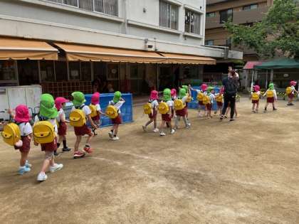 今日はとってもいいお天気、5歳児4歳児 八幡屋公園に園外保育に出かけます