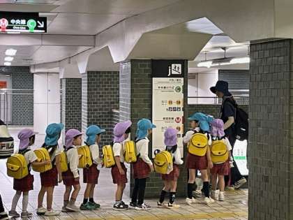 地下鉄構内をきちんと並んで歩きます。公共のマナーを経験を通して学びます。