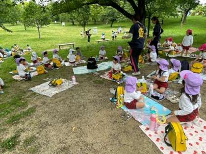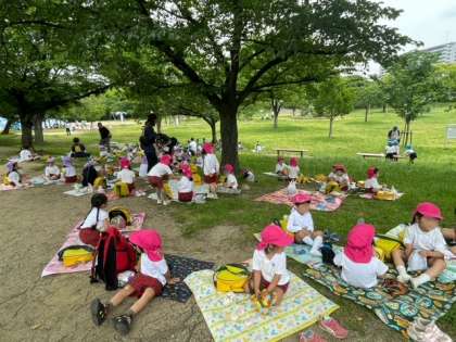 ?たくさん遊んだあとは、おにぎりを食べました。公園に着いた時から「おなかすいた〜」と言っている子どもたちがいましたよ。程よい曇り空で、そよ風が吹いていて