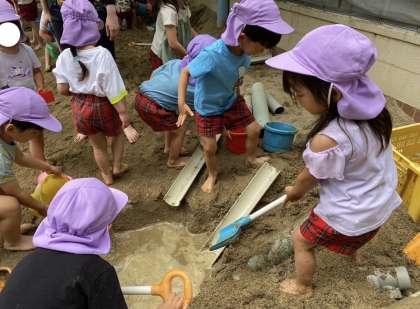 砂場では大きなスコップ、小さいスコップで土を掘り、大きな温泉ができました。