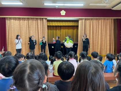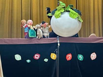今日は、キャロットクラブの皆さんが幼稚園に来てくださいました。キャロットクラブは靱幼稚園の元保護者の方々です。子どもたちのために30年くらい人形劇をされているそうです。手作りの人形や舞台の小物、演じる声、とっても素敵です。今日はパネルシアターに続き、「大きなかぶ」の人形劇が始まりました。子どもたちは皆お話の世界に入り込み、登場人物を応援したり喜んだり、まるでライブ会場のようでした。キャロットクラブの皆さんも、子どもたちの反応がすごくて舞台裏にしっかり伝わってきたと喜んでくださいました。キャロットクラブの皆様、ありがとうございました。