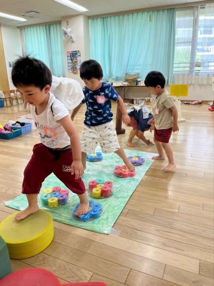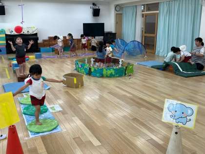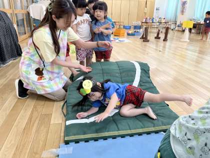 もも組は、3階の多目的室で虫さんのお散歩ごっこを楽しんでいます。トンネルをくぐったり、風船までジャンプしたり、お山を転がったり、カエルのジャンプをしたり、いろいろな動きに挑戦しています。疲れた時は、草のお家でひと休み。新聞紙のシャワーをかけたり、その中で泳いだり、友達と「わーい♪」と言いながらとっても楽しそうです。裸足で遊んでいるので、足の裏の感触も存分に楽しんでいます。