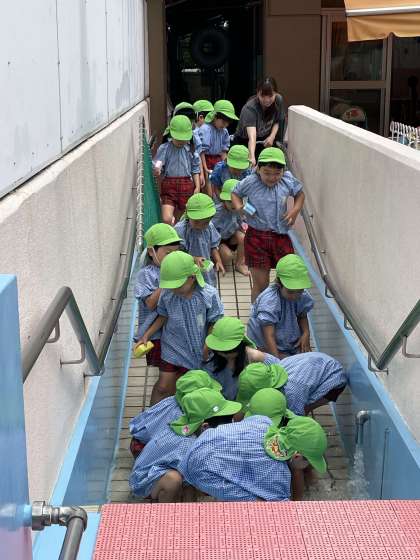 プールの中に入るだけで、スポンジを手に持つだけで、ワクワクがとまらないのか笑顔いっぱいでゴシゴシ掃除をしていましたよ。来週からのプール遊び、楽しみだね!