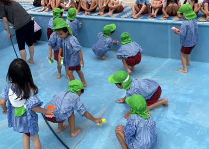 なので今日は5歳児のみんなで、プール清掃の仕上げをしました。