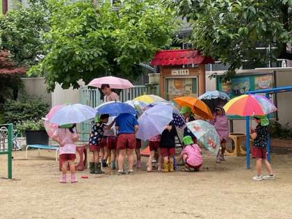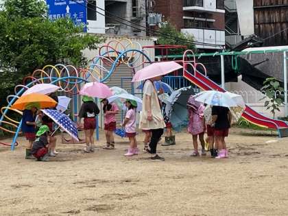 今日も雨が降りプール遊びができませんでした。そんな中、5歳児うめ組とゆり組は傘をさして園庭をお散歩していました。傘にあたる雨の音や地面の様子など、雨のお庭でたくさんのことを発見したようです。傘をさして先生や友達と一緒に歩く…それだけでなんだか特別にワクワクする気持ちがしたようです。晴れてプールに入りたいけど雨でも楽しい経験ができました。