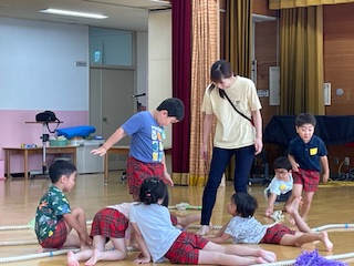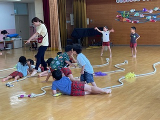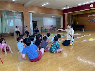 ?5歳児ゆり組担任が園内研究保育をしました。保育のねらいは「力をこめて引っ張ったり足で踏ん張ったりすることを楽しむ」「安全な遊び方や守るべきルールに気づく」でした。裸足になり綱の上をバランスをとりながら歩いたり、先生の話を聞きながら自分たちの遊びを振り返ったりしていました。