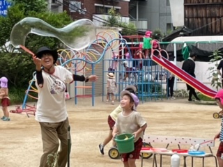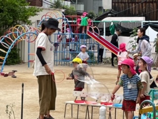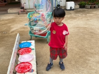 ?シャボン玉…吹いて作るのではなく、すくって振って作るのでずいぶんコツがいります。友達や先生がするのを見ながら、何度も繰り返しながらコツをつかんでいきました。大きなシャボン玉ができるととっても喜んでいました。