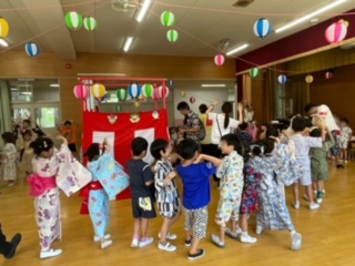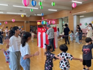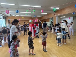 夏休み初日、PTAと育友会主催の夏祭りが行われました。PTA役員や各委員会の皆さんが企画準備されこの日を迎えました。2階遊戯室ではやぐらと提灯と和太鼓の音色が夏祭りの雰囲気をもりあげてくれ、保護者がお店番をしている子どもたちが先生と一緒に「アラレちゃん音頭」を踊りました。