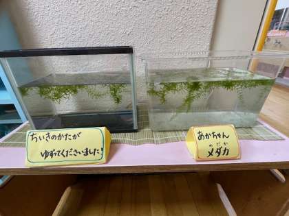昨日地域の方からメダカをいただきました。産まれたての小さな赤ちゃんメダカや少し大きくなったメダカたちです。夏休みの預かり保育に来る子どもたちや保護者の皆さんぜひご覧くださいね。