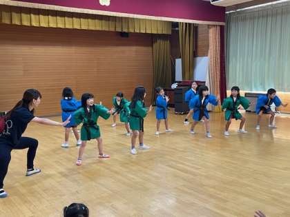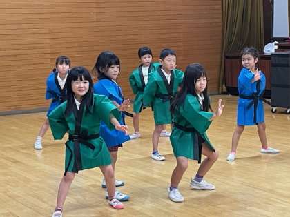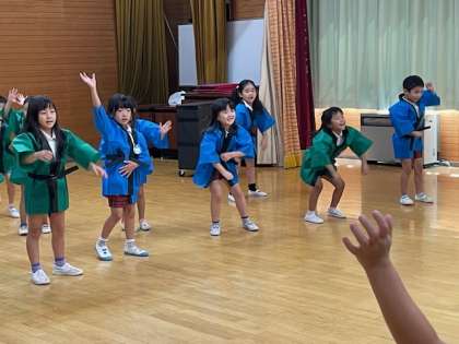 5歳児の子どもたちが ソーラン節を踊っています。涼しい遊戯室で音楽を聞いてリズムを感じながら存分に動いています。大きな声を出し、腕を伸ばし膝を曲げ、とっても力強いソーラン節です。