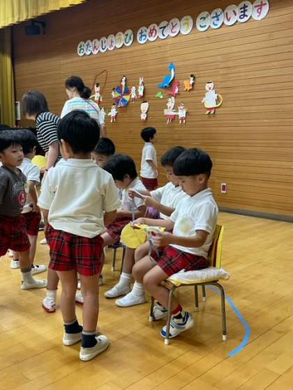 9月生まれの子どもたちの誕生会を行いました。遊戯室いっぱいに「おめでとう〜」のお祝いの言葉が何度も何度も誕生児たちに……