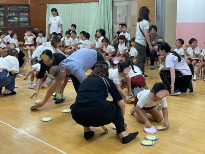 保護者の方と子どもたちの遊びは、?ウサギとお月様のひっくり返しゲーム“でした。大人と子どもの真剣勝負、勝ったのは子どもチームでした。