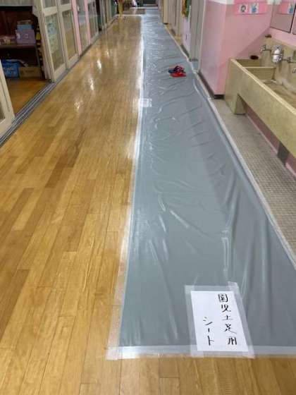 園舎内に入るのでシートの上を歩きます。保護者の皆さんは外靴を脱いでお入りいただき、シート以外の場所を歩いてください。