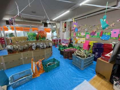?運動会に使う物をプログラム順に並べました。子どもたちが楽しんで活動する様子が目に浮かびます。廊下にシートを敷きました。子どもたちは外靴を履いたままで