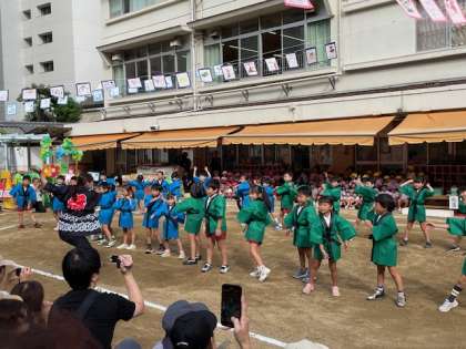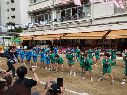 お天気や園庭の状態を心配していましたが、無事に開催することができました。オープニング「ソーラン節」クラスカラーの法被を着た5歳児の子どもたちが大勢の観客の前で踊りを披露しました。元気いっぱいの動きとかけ声が会場の雰囲気を明るくもりあげてくれました。