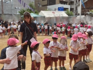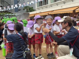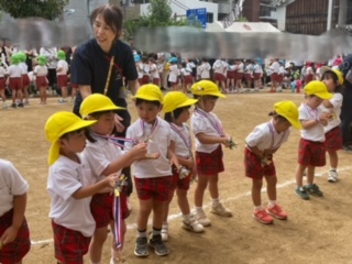 金メダルを担任の先生から首にかけてもらいとっても嬉しそうな子どもたちです。みんなよくがんばりました。運動会に来てくださったら皆様、子どもたちを温かく見守り拍手や声援を送っていただきありがとうございました。