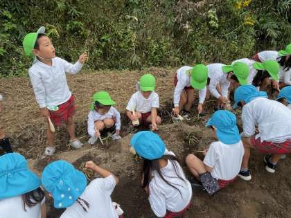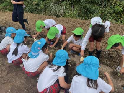 お芋掘りをしました。前日の雨のおかげでとっても掘りやすかっです。心配していた水たまりは全くなくて安心しました。