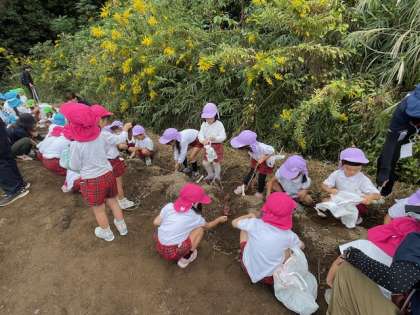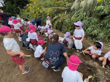 今年の夏の猛暑と雨不足でお芋は少なめでしたが、子どもたちは小さいお芋でも芋の頭が見えると大喜びしていました。
