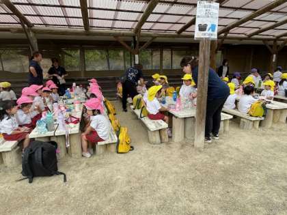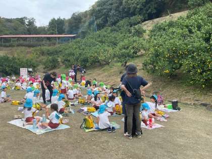 みかんの木がたくさんある山のふもとでおにぎり弁当を食べました。
