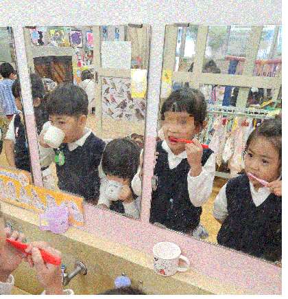 お弁当の後も鏡を見ながら、「ありさんみがきでみがくよー」「おくばもしっかりみがく!」と丁寧に歯みがきしている姿がみられました。