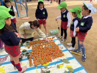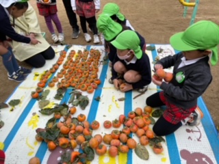 「いったいいくつあるのかな?」「並べてみよう」「幼稚園の子どもたち110人、2個ずつ持ち帰るなら220個か…」子どもたち、先生、柿を見ながらいろいろ考えています。このあと220個になるように収穫して数えました。まだ実をつけている柿の木が静かにその様子を見守っているようでした。作品展の日に持ち帰る予定です。お楽しみにしてくださいね。