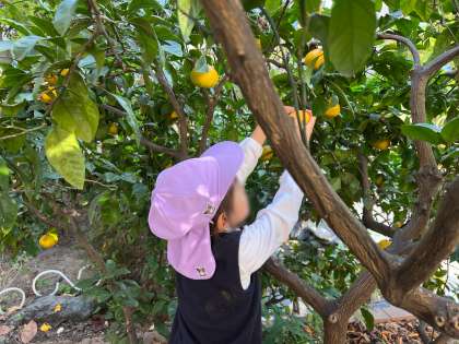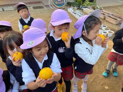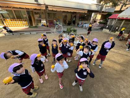 園庭の秋探しの探検に行った時から見つけていたミカンを子どもたちと収穫しました。