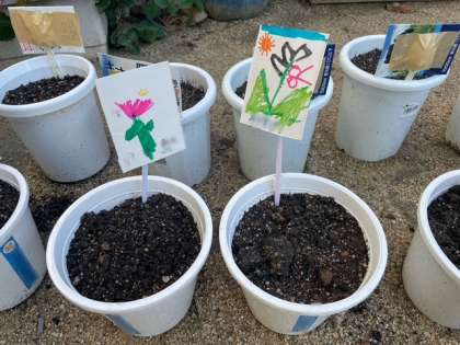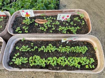年長組の子どもたちが二十日大根の種を蒔きました。あっという間にこんなにたくさん芽が出ました。間引きをして育てていきます。チューリップの球根も植えました。この花が咲くのは、幼稚園を修了して一年生になるのを楽しみにしている頃ですね。