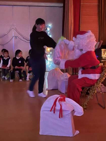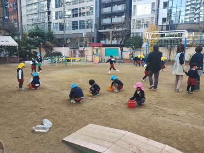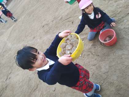 お楽しみ会が終わって園庭に出るとびっくり!!園庭に氷がたくさん落ちていました。きっとサンタさんが帰っていった跡だね。「サンタさんソリに乗って空飛んで帰ったんや!」とサンタクロースへの夢や想像をたくさん広げてお話していました。